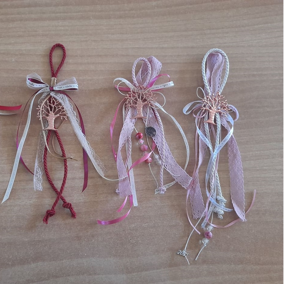 Γούρια με μεταλλικά ροζ χρυσά δέντρα της ζωής και κορδέλες σε διάφορες αποχρώσεις.
