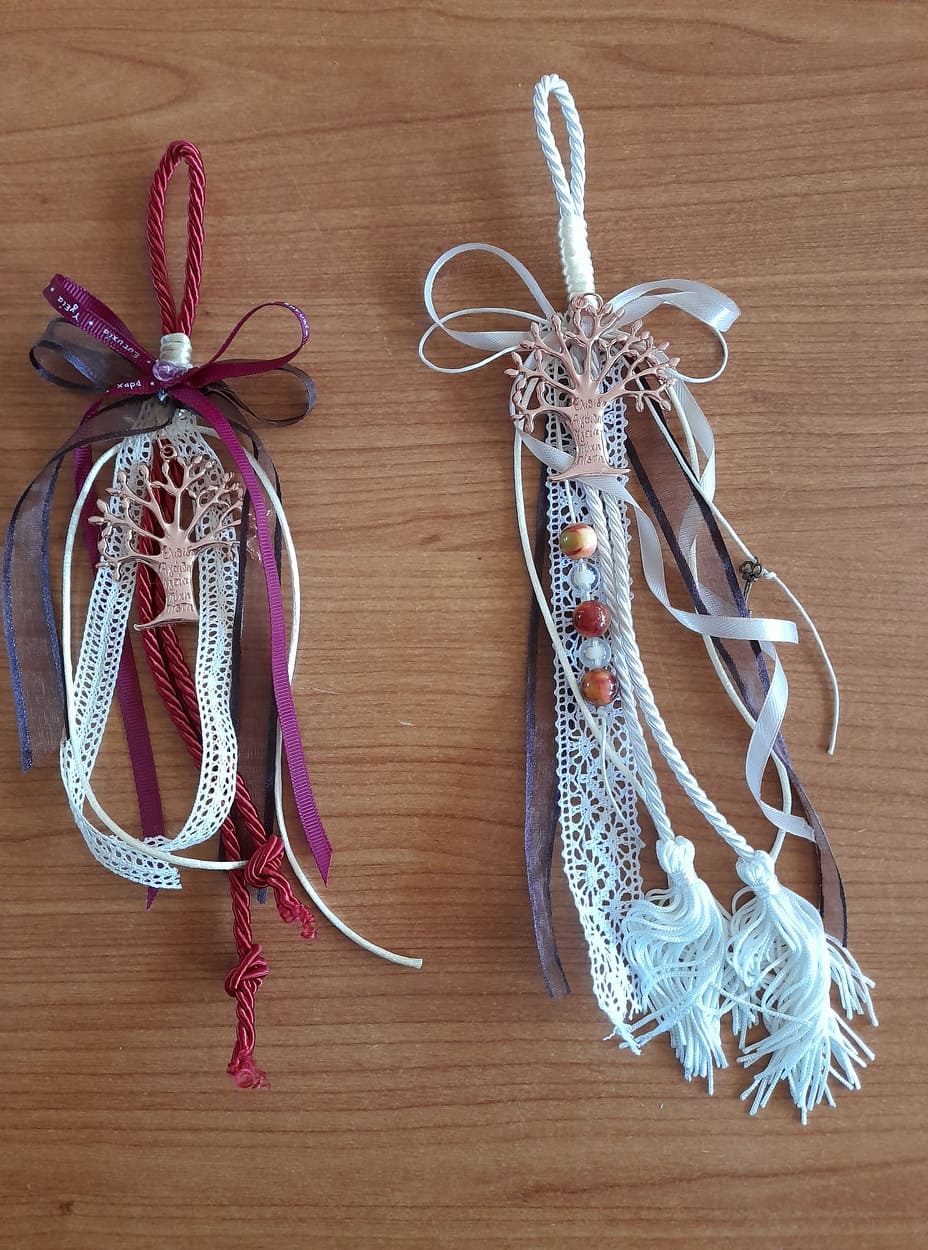 Γούρια με μεταλλικά ροζ χρυσά δέντρα της ζωής και κορδέλες σε διάφορες αποχρώσεις.